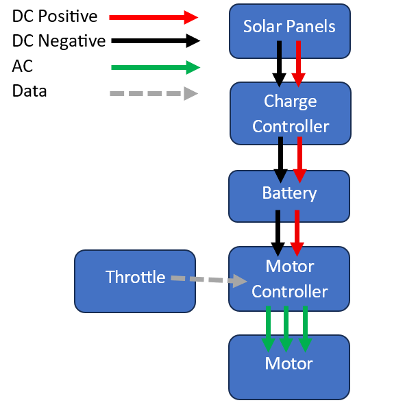 The solar boat system can be split into two subsystems: Energy generation (upstream of the battery) and Energy consumption (downstream of the battery)
