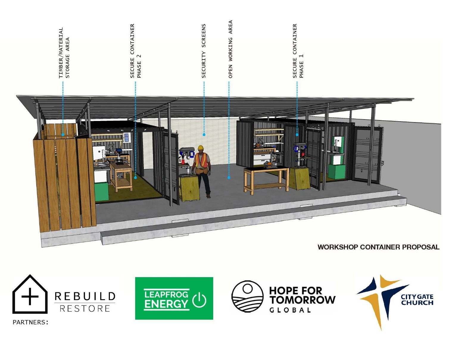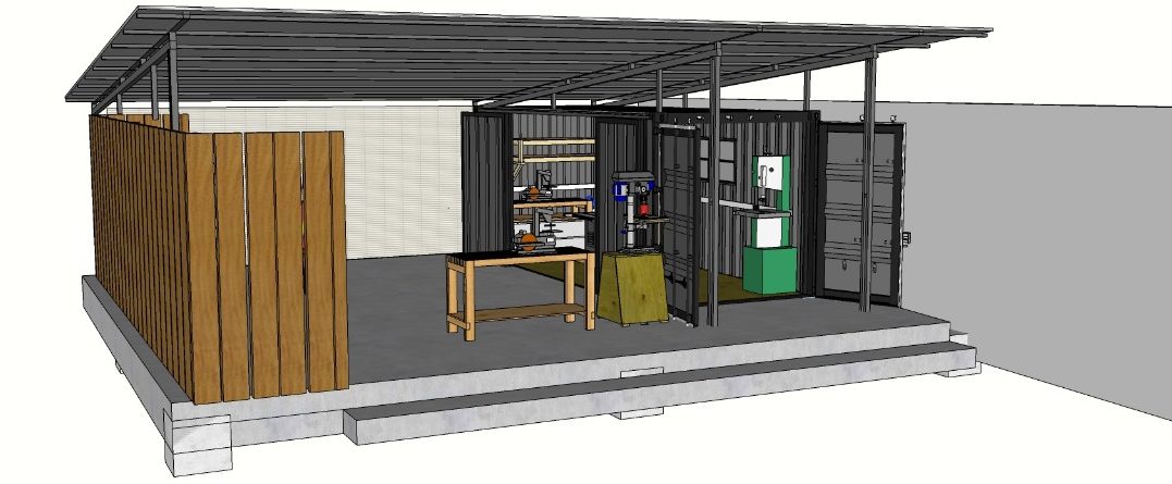Phase 1 is the core construction stage of the project. It includes the conversion of the first 20ft shipping container, along with the construction of the workshop floor and roof. This phase will deliver a fully functional workshop, providing a space for training, fabrication, repairs and student projects.